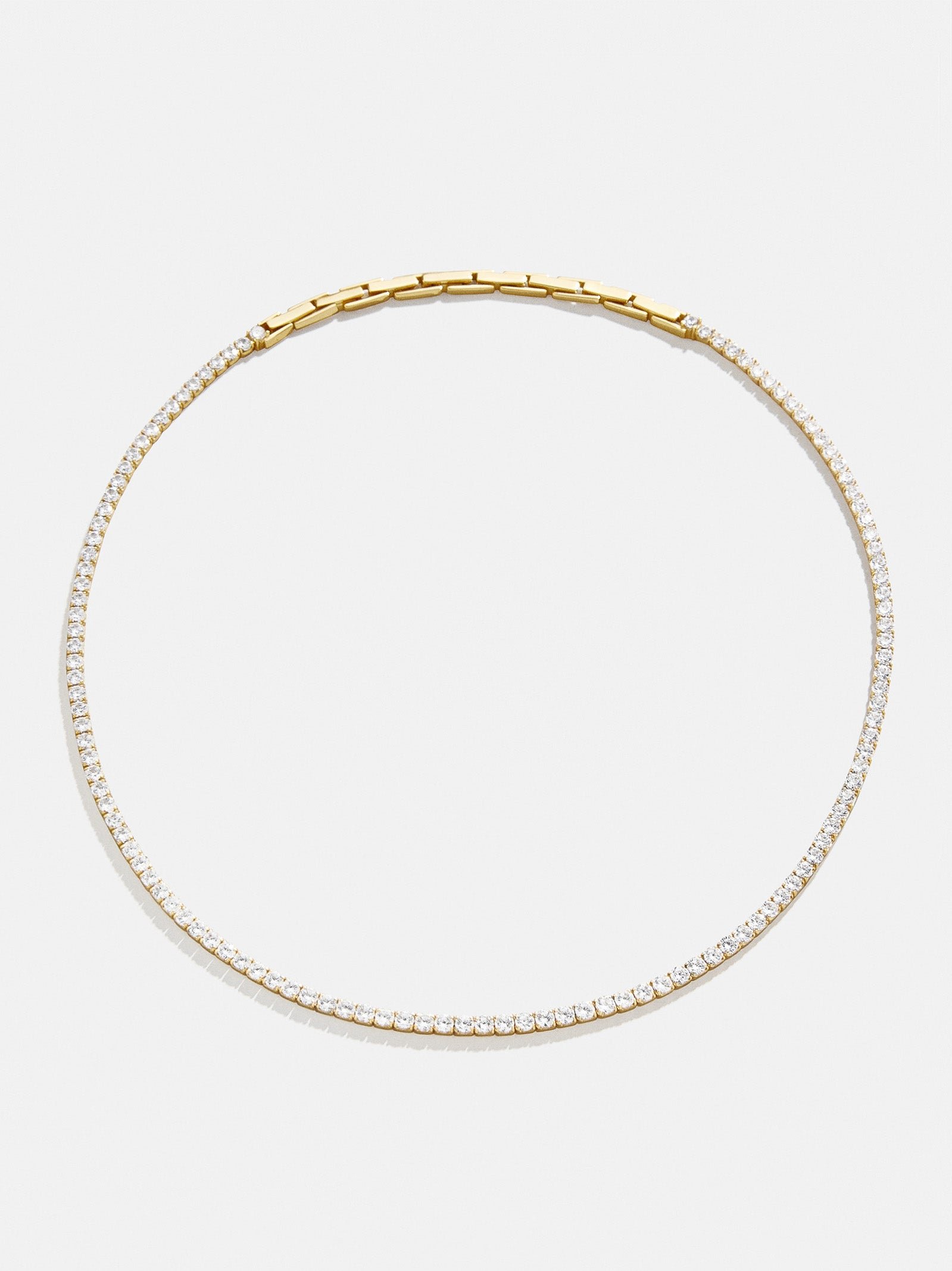 If you’re looking to add just one necklace to your wardrobe. the Bennett 18K Gold Adjustable Tennis Necklace is it. Crafted with Cubic Zirconia stones. this riviera-style piece features plenty of sparkle and subtle. 18K Gold hardware. This necklace is a classic accessory you’ll have in your jewelry box forever.