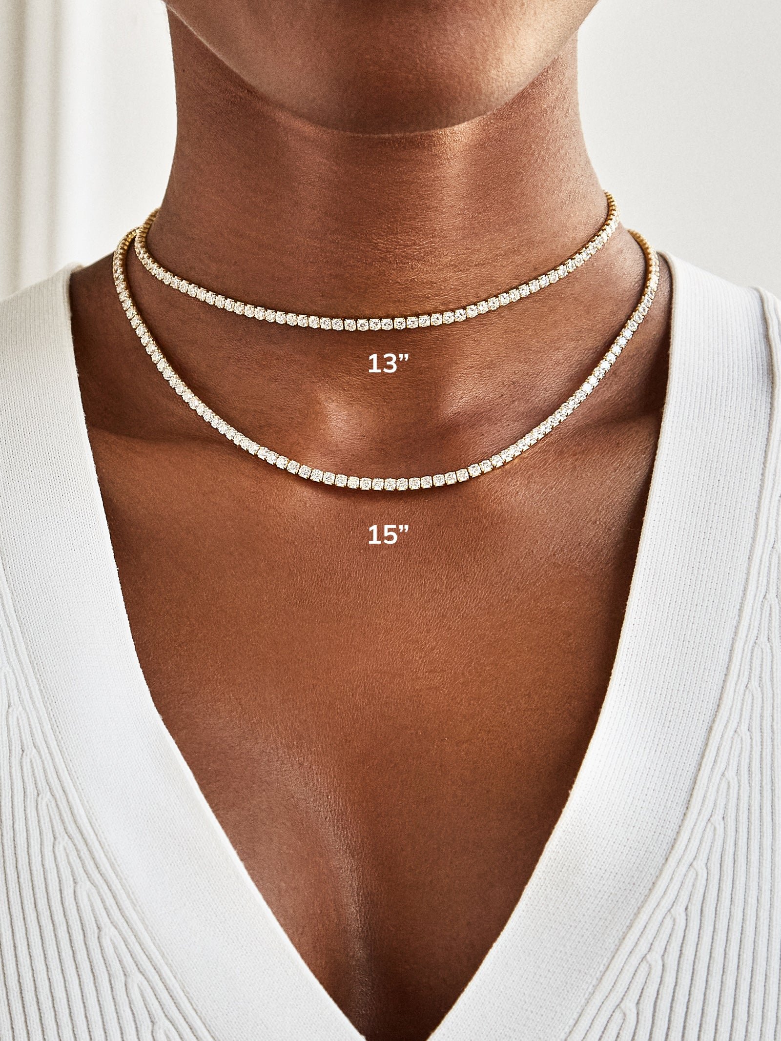 ABOUT OUR ADJUSTABLE NECKLACES: Our inventive. one-of-a-kind box clasp extender allows for maximum versatility. This necklace can be styled as short as 13 and as long as 15. Whether you want to wear this as a trend forward choker. a close-fitting collar. or a longer layer in your stack. you can easily remove or add box clasps to sport your new necklace at any length you please. without any dangling chains. Note that clasp should be worn on the right side of neck.