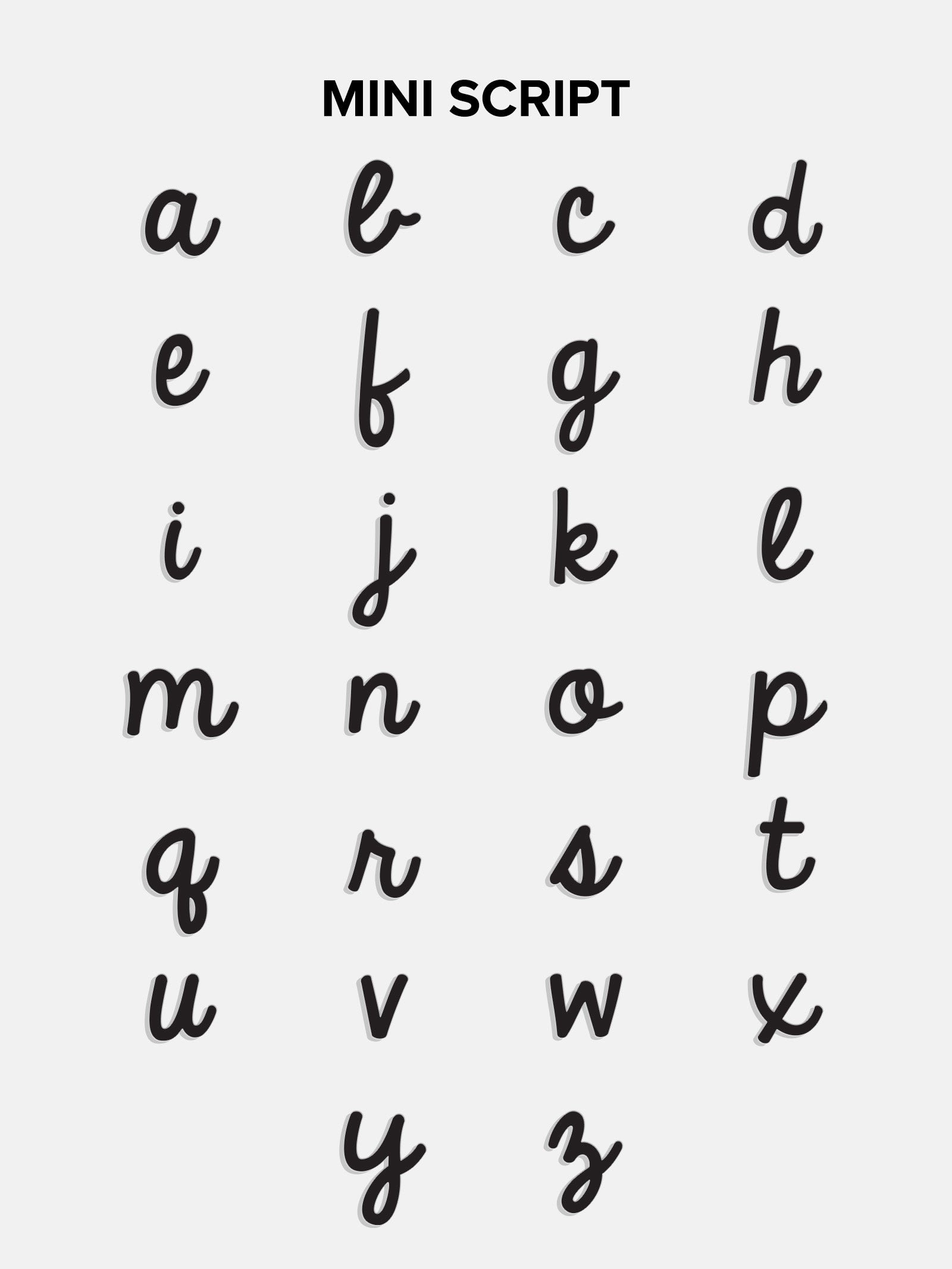 - Available in a lowercase script font or a bold uppercase block font