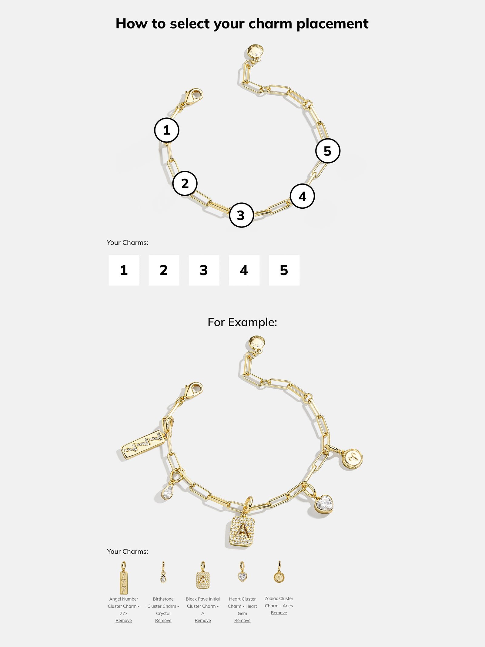 Personalize your wrist stack with the Spaced Custom Charm Bracelet. Choose between a classic gold-colored chain. a Hera chain. or a paperclip chain. Then. pick 5 cute charms of your choice. in the order that you’d like. Made just for you. this bracelet will be an everyday must-have.